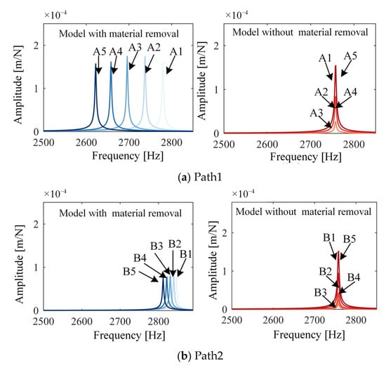 In order to make a comparison, the case without varying the dynamics of the part was also performed to predict the FRFs and SLE as well. Both input parameters were the same for these two methods. The points to predict the FRFs in each path are illustrated in Figure 12, and the calculated FRFs are shown in Figure 13. The natural frequency variation in each path was reflected by the model with material removal, and the changing range is illustrated in Table 3. However, the difference in the FRFs of the points in each path is only shown in magnitude for the model without material removal.