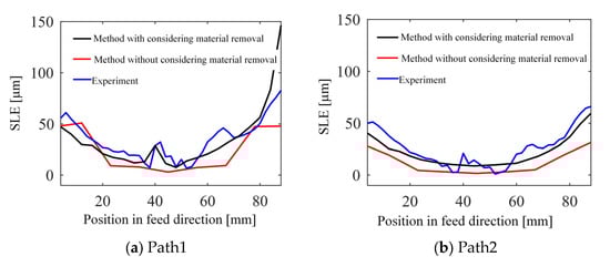 Figure 14 plots the SLE obtained by the experiment and the methods with and without considering material removal. It can be seen that the errors in the SLE on the points of each path were all lower for the proposed method, and the average value of SLE errors was reduced from ~10 μm to ~5 μm as illustrated in Table 4. The complex changes in chip thickness at the initial and final positions in the processing direction led to a significant increase in SLE in the corresponding positions.