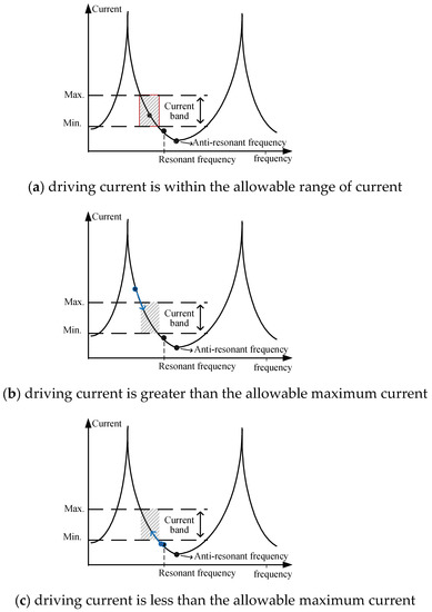 In this paper, the developed frequency control method is based on the current versus frequency characteristics of piezo ceramics. As shown in Figure 6a, when the operating frequency of the power driver is in the left of the resonant frequency, the piezo ceramic produces mechanical vibration, and a single frequency corresponds to a single current. That is, when the piezo-ceramic current is within the allowable range, the operating frequency will be close to the resonance point of the piezo ceramic. At this time, the driver can output sufficient power to produce mechanical vibration. There is thus no need to change the driving frequency. By increasing or decreasing the duty ratio of the power switch at the driver, the current or power control can be achieved. However, when the piezo-ceramic status changes, the proper frequency point of the circuit would change. As shown in Figure 6b, the current that corresponds to the original frequency exceeds the upper limit of the current setting, which shows that the frequency has deviated from the range of the resonant frequency. Therefore, the power driver needs to speed up the switching frequency to suppress the current and make the operating frequency closer to the resonance frequency. On the other hand, as shown in Figure 6c, if the current corresponding to the operating frequency is too small, the switching frequency should be reduced to increase the output current of the piezo-ceramic driver for maintaining a stable resonance.