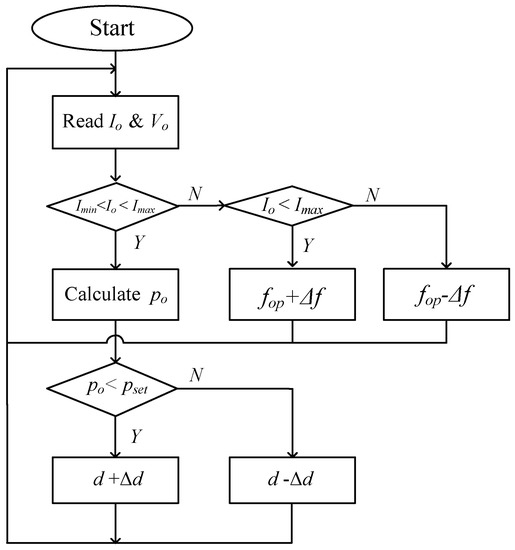 Based on those ideas, the control flowchart is plotted in Figure 7.At the beginning of the control process, the output current is measured to confirm it can reach the allowable current level. If the output current is less or greater than the preset current, the controller will adjust the switching frequency according to the rules in Figure 6. That is, exceeding the upper limit set by the current, the proposed controller will increase the switching frequency fop to make the operating frequency closer to the resonant frequency. Instead, the switching frequency will be reduced. In addition, if the input voltage or temperature changes or other uncertainties in the circuit occur, there is an unexpected change in the operating power of the piezo-ceramic load. In this case, the constant output power procedure will be executed. As shown in Figure 7, this study uses a voltage- and current-detecting circuit, which can calculate the instantaneous driving power po. Then if the output power is higher than the preset power pset, the controller will reduce the PWM duty cycle of power switches (d − Δd), thereby reducing the power output. In contrast, if the output power is lower than the preset power, the control circuit will increase the duty cycle (d + Δd). These adjustments to the duty cycle will continue until the power signal is within the preset range. Note that when the circuit is started, an initial frequency is sent from the controller to make the driving circuit run first. The output current of the driver is then fed back after the circuit stabilizes. At this time, the power driver will judge the piezo-ceramic status and adjust the proper operating frequency. Usually, the initial frequency is intentionally set closer to the resonance frequency range of piezo ceramics. In this way, the possible excessive starting current can be suppressed by using the resonance characteristic of the circuit. The problems caused by overcurrent of the power driver during startup can be avoided.
