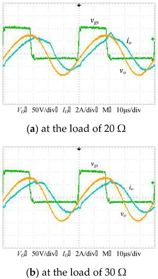 Next, the study has also tested the prototype circuit with its application to the constant power control under 100 VA and 200 VA. Figure 10 and Figure 11 depict these experimental waveforms, in which a sinusoidal output voltage is obtained after the circuit operates. In all test cases, the phase angle of voltage clearly leads the current with a high turn-ratio transformer connected, signifying that each switch in the inverter is activated before its current becomes positive and confirming that the power driver effectively performs the ZVS operation. In addition, as seen from the waveform of the triggering signal, the controller reduces the length of duty cycle when the load changes from 30 to 20 ohm. In this way, a different voltage gain can be grabbed to stabilize the output voltage and ensure that the power output of the circuit is less affected by the change of loads. In this test, the input and output powers are measured at 112.8 W and 103.3 W for the load of 30 ohm and at 222.3 W and 204.5 W for the load of 20 ohm. The circuit efficiencies are 91.6% and 92%. These test results show that the ZVS operation in the inverter is beneficial for reducing the power losses of the proposed inverter.