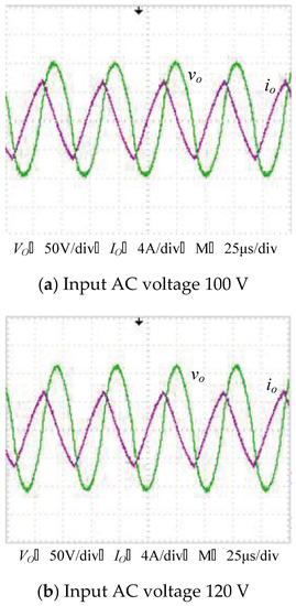 This test is aimed at examining the circuit response to different loads. The test waveform is obtained when the ac input voltage is fixed at 100 V. Figure 9 depicts the test results of different load conditions, where the output voltage of the resonant circuit is seen well stabilized under different scenarios. In the test, the voltage amplitude is measured at 77.8 V at no load, 78.8 V at a half load and 80.6 V at full-load conditions. This result helps verify that the proposed circuit can serve as a voltage source.