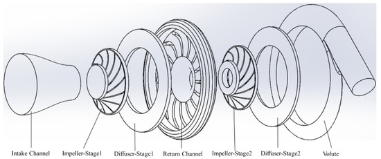 The two-stage compression-type magnetic levitation centrifugal compressor discussed in this study is comprised five flow elements: the inlet zone, impeller zone, diffuser zone, deswirl vane zone, and volute casing. The numerical simulation was performed in stages in this study. The first stage compression includes the inlet zone, impeller zone, diffuser zone, and deswirl vane zone. The second stage compression includes the inlet zone, impeller zone, diffuser zone, and volute casing. The inlet zone is a flow element configuration without inlet guide vanes. The impeller zone is an enclosed impeller that reduces the influence of leakage loss. The diffuser zone is a vaneless diffuser. The major function of the deswirl vane zone is to compress refrigerant using the first stage smooth flow into second stage impeller inlet. The volute casing collects the refrigerant flowing out of the diffuser zone and delivers it to the compressor outlet. The fluid kinetic energy is converted into pressure energy in the process. The compressor flow elements are shown in Figure 1.