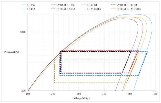 According to Montreal Protocol–Kigali Amendment [21], countries around the world will scale down or prohibit the selling and using of air conditioning equipment with hy-drofluorocarbon (HFC) refrigerant in the future. Hence, the replacement of HFC refrigerant is imperative in the future. At present, the promising alternative refrigerants include R-1234yf refrigerant, R-1234ze(E) refrigerant, and R-513A refrigerant. According to the comparison diagram of the refrigerants, in the same evaporation condition, the R-1234yf refrigerant has a smaller enthalpy difference. Thus, if R-134a refrigerant is replaced by R-1234yf refrigerant, the compressor power consumption may increase. Furthermore, as the saturation pressure of R-1234ze(E) refrigerant decreases too much in the same evaporation condition, R-1234ze(E) refrigerant is not discussed herein, as shown in Figure 2.