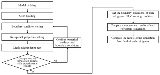 This study referred to the method of Ho et al. [16]. A compressor 3D model was built using SolidWorks drawing software and converted into a .step file, drawn in the Ansys-SpaceClaim drawing software for model building. Ansys-Meshing created the simulation mesh and the IPLV numerical simulation of R-513A refrigerant was then performed. The simulation result and the flow field were analyzed to observe if abnormal flow behavior occurred. The characteristic curves and compression ratio and flow efficiency curves were solved. The above method compared the numerical simulation results with shaft power and total pressure ratio experimental results in the literature. The results show that the simulation and experiment exhibited a consistent growth trend and confirmed the reliability of the procedure proposed in this study. Figure 4 shows the research procedure.