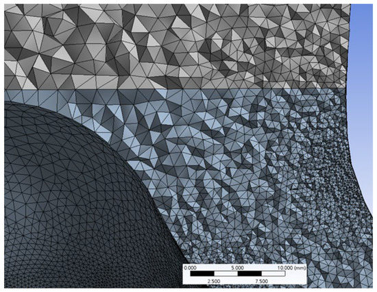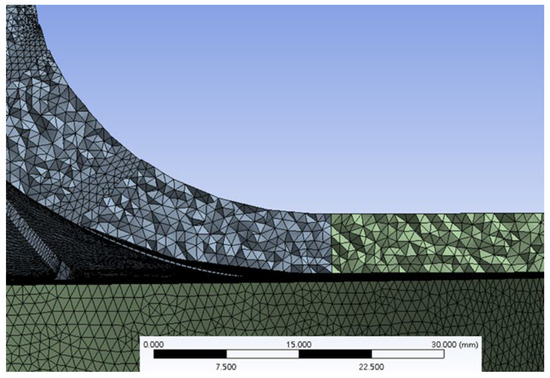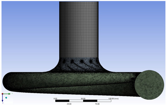 Meshing is an important part of CFD simulation analysis. Improper meshing or incorrect boundary conditions can significantly influence the numerical simulation results. Creating a good mesh is especially important in CFD application. The mesh size will determine the quantity of cells and the calculation results. The mesh quality will determine the calculation convergence difficulty and the simulation results accuracy. Therefore, the two-stage centrifugal compressor mesh geometry was grown repeatedly. The mesh quality was verified and the computing time was considered. As a result, a mesh with excellent quality and about 6 million cells was grown. Additionally, this study performed numerical simulations of the first stage compression and the second stage compression individually. So, in the Stage 2 simulation model, an inlet straight pipe must be created in front of the impeller, which is helpful to the correctness of numerical simulation analyses, as shown in Figure 5, Figure 6, Figure 7 and Figure 8.