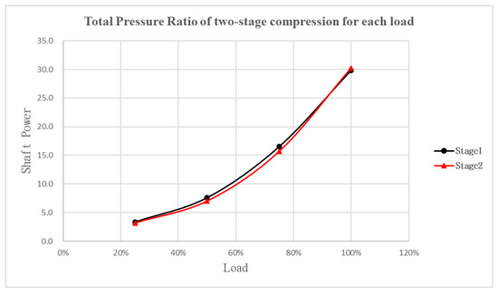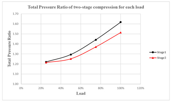 - The pressure ratios for the first and second stage compressors decreased with the load. The pressure ratio for the first stage compressor decreased from 1.62 to 1.22. The pressure ratio for the second stage compressor decreased from 1.51 to 1.21.