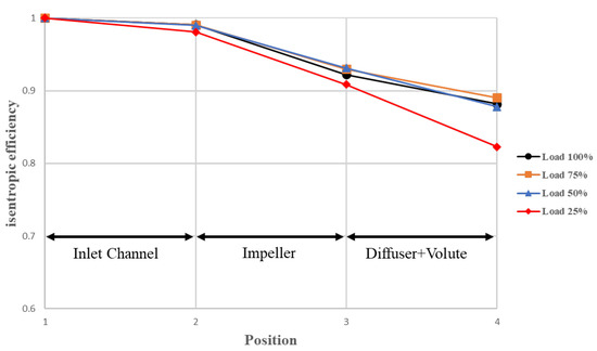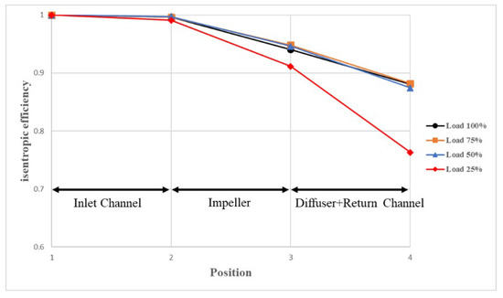 This study performed numerical simulation analysis according to the compressor flow elements configuration, including the inlet tube, impeller, diffuser, deswirl vane, and volute casing. The inlet face was taken as the reference plane to judge the isentropic efficiency variation in the compressor flow elements. As shown in Figure 12 and Figure 13, the first and second stage fluid compression moved from the inlet tube to the deswirl vane or volute casing through various flow elements. The isentropic efficiency decreased and the isentropic efficiency slope descended further in the 25% load case than in the other three cases.