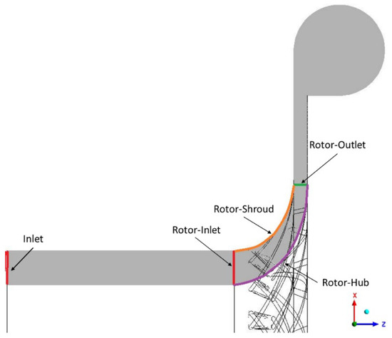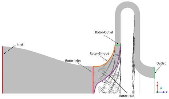 The first stage meridional flow field sampling location is on the ZX plane based on the rotor revolving shaft. The meridional flow field variation is displayed as a half section. The first stage R-513A refrigerant fluid moved into the inlet marked in red and out of the outlet marked in green. The orange mark represents the impeller shroud, the purple mark represents the impeller hub, and the impeller rotation direction is indicated in the z-axis. All of the above marks are shown in Figure 14 and Figure 15.