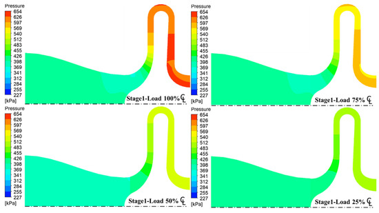 According to the pressure meridional contour maps under various loads, the maximum pressures of the first and second stage compressions occurred at the outlet under the full load condition. The minimum first stage compression occurred at the impeller inlet under the full load condition and 75% load. The pressure rose gradually in the direction normal to the streamline when passing through the impeller flow elements. As a result, the maximum pressure gradient was on the meridian plane of the first stage compression under full load condition. As the load decreased to 25%, the first stage compression impeller inlet pressure rose, the outlet pressure decreased, and the second stage inlet pressure and outlet compression decreased, as shown in Figure 16 and Figure 17.