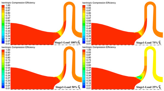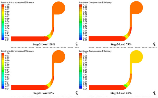 According to the meridional contour maps for isentropic efficiency at various loads, the isentropic efficiency values for the first and second stage compressions at the inlet remain approximated to 1. However, the isentropic efficiency value decreased as the impeller flow elements rotated. The isentropic efficiency value at the outlet was influenced directly. In the first and second stage compressions, the isentropic efficiency values at the impeller and outlet decreased with the load. In the 25% load case, the isentropic efficiency drop in the first stage compression was larger than that in the second stage compression, as shown in Figure 18 and Figure 19.
