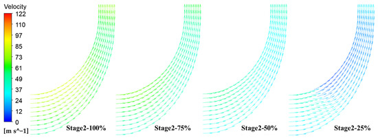 From 100% to 75% loads, the isentropic efficiency of the first and second stage compression was higher than 87%. In the 75% load case, the first and second stage compression had the maximum isentropic efficiency values, at 88.19% and 89.06%, respectively. In the 25% load case, the isentropic efficiency values for the first and second stage compression decreased to 76.30% and 82.28%, respectively. According to the isentropic efficiency value variation, the isentropic efficiency value was obviously lower in the 25% load case. This might be because the flow field was relatively disordered inside the compressor, leading to losses, as shown in Figure 11.