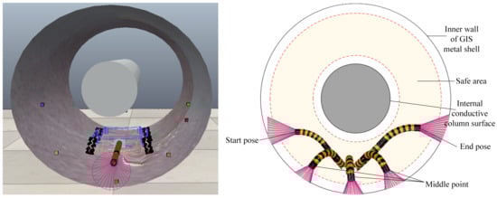 In a narrow and unstructured environment such as GIS, a four-wheel omnidirectional mobile robot equipped with a two-segment flexible manipulator is used to perform video inspection inside the cavity. In the inspection and maintenance of the GIS equipment, continuous video inspection tasks are conducted on the inner wall of the GIS cavity and the surface of the conductive cylinder. Such tasks require that the center line of the camera at the end of the flexible manipulator should be as perpendicular as possible to the photographed surface (i.e., attitude constraints), thus obtaining the clearest actual situation of the photographed surface. Essentially, the continuous video inspection of the inner wall of the GIS cavity is a continuous path motion problem for the manipulator. For such a problem, besides the start and end poses, several path points need to be given. When the flexible manipulator moves, it needs to start from the starting point and then pass through the necessary points successively to reach the end pose and avoid obstacles.