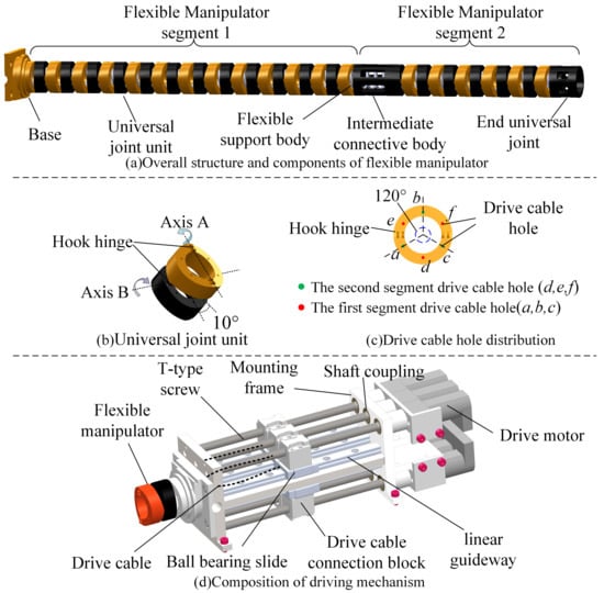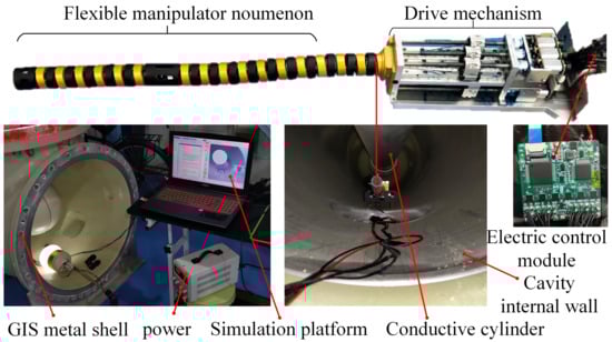 A GIS cavity is characterized by narrow and limited space, a complex assembly structure, many obstacles, and different layouts of phase lines in and out. Besides, GIS is a high-voltage device, and the inner wall is not allowed to be scratched. Therefore, operation and maintenance tools are required to not cause damage to the power equipment. Thus, the flexible manipulator adopts the rigid-flexible coupled composite structure, as shown in Figure 2. It is driven by six NITI alloy wires that are evenly distributed in each universal joint. The motion of the flexible manipulator is controlled by the action of the ball screw sliding table mechanism. The new flexible manipulator has the characteristics of a small volume, lightweight, and flexible movement.