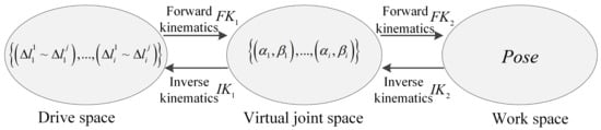 A geometric model based on the piecewise constant curvature hypothesis is established in this paper for the cable-driven flexible manipulator, and virtual joint space variables are introduced to represent the rotation angle and the bending angle of the single segment joint, respectively. represents the length change of the drive cable, where i represents the number of current segment, and j represents the number of drive cable. In this case, the kinematic model of the linear drive flexible manipulator consists of two parts: one is the mutual mapping between the drive space composed of all the drive cables and the artificially introduced virtual joint space; the other is the mutual mapping between the artificially introduced virtual joint space and the working space of the manipulator end. Then, the forward kinematics relationship () can be summarized as the mapping () from the manipulator drive space to the virtual joint space and the mapping () from the virtual joint space to the working space of the manipulator end. Meanwhile, the inverse kinematic relationship () is the mapping () from the end workspace of the manipulator to the virtual joint space and the mapping () from the virtual joint space to the drive space of the manipulator, as shown in Figure 3. In the first two spaces, the subscript i represents the continuous joint of the first segment; the superscript j represents the number of drive cables required by the joint of this segment, and its value can be 3 or 4.