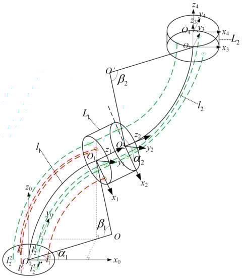 To establish the constraint model, the geometric model of the flexible manipulator is analyzed first. The manipulator body consists of two continuous joints and two translation segments. The base coordinate system is established at the center of the bottom of the first continuous joint, the coordinate system is established at the center of the end of the first continuous joint, the second continuous joint base coordinate system is established at the end of the first continuous joint, the second continuous joint end coordinate system is established at the end of the second continuous joint, and the robot workspace coordinate system is established at the center of the second continuous joint. Specifically, the positive direction of the X-axis of the base coordinate system points to the direction of the first drive cable hole, the positive direction of the Z-axis is the upward direction of the x-y plane of the vertical base coordinate system, and the positive direction of the Y-axis is determined following the right-hand rule. All other coordinate axes are the same as those in the base coordinate system . In Figure 4, are the bending angles of the first segment and the second segment with respect to the plane of their base coordinate systems, and the rotation angles are the rotation angles with respect to the X-axis of their base coordinate systems. Each segment of the designed two-segment flexible manipulator is driven by three driving lines. Therefore, in the base coordinate system of the first segment, a through hole is designed every 60° in the counterclockwise direction from the X-axis, with a total of six through holes to drive the movement of the two-segment flexible manipulator. The hole number ~ is the drive cable through hole of the first continuous joint, ~ is the drive cable through hole of the second continuous joint, and r is the distance from the center of the base coordinate system to the drive cable through hole.