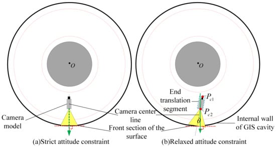 In continuous video inspection of the inner wall of the GIS cavity or the surface of the internal conductive column by using the flexible manipulator, the center line of the camera at the end of the flexible manipulator is always perpendicular to the positive section of the photographed surface under ideal conditions (the angle between the normal vector of the camera center line and the positive section of the photographed surface is ), i.e., the strict attitude constraints are satisfied. However, the actual situation is that the two-segment flexible manipulator is difficult to satisfy the strict attitude constraints in real motion. Therefore, this paper considers further relaxing the strict attitude constraint so that the center line of the camera at the end of the manipulator is always within a certain angle with the normal vector of the positive section of the photographed surface, i.e., the relaxed attitude constraint conditions are satisfied. The comparison of the strict attitude constraint model and the relaxed attitude constraint model is shown in Figure 5. Each of these constraints is described mathematically below.