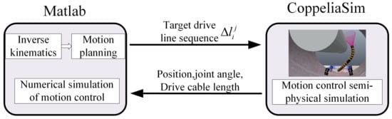 The time-optimal drive cable trajectory obtained by the optimization algorithm is used as the input to control the two-segment flexible manipulator, and the experiment is conducted according to the simulation and experimental schematic diagram shown in Figure 9. In the process of simulation and experiment, when the target drive cable is positive, the DC motor should draw the line towards the base of the flexible manipulator; when the target drive cable is negative, the motor should release the line towards the end of the manipulator. Since pure numerical simulation is conducted in Matlab, the Matlab simulation results are taken as the reference target to compare the virtual simulation of the manipulator motion control with the experimental results of the prototype. Meanwhile, to test whether the camera at the end of the flexible manipulator arm can capture specific conditions in the environment during its movement, small squares with different colors are added to the surface of the GIS simulation body wall in CoppeliaSim to simulate small foreign bodies in the actual environment.