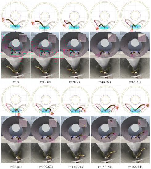 After the completion of Matlab simulation, CoppeliaSim simulation, and GIS prototype experiment, the simulation and experimental results are compared. Figure 10 shows the comparison of the motion timing sequence obtained by simulation and prototype experiment. The transparent arm shape in the motion timing sequence obtained by Matlab represents continuous video inspection path points, and the arm shape of the camera field marked with red at the end is the actual path in motion. It can be seen from the figure that from t = 0 s to t = 166.34 s, the two-segment continuous manipulator can pass through the intermediate waypoint successively to complete the continuous video inspection of the inner wall surface of the GIS cavity. During the whole process, there is no collision between the manipulator and the environment. Meanwhile, in the whole process, the center line of the camera at the end of the manipulator should be as perpendicular as possible to the normal section of the inspected surface to satisfy the constraint of relaxed posture. The upper right picture of the CoppeliaSim simulation sequence diagram in Figure 10 records the camera field of view at the end of the flexible manipulator during the moving process, indicating that the trajectory obtained by the JS algorithm can be used for video inspection tasks.