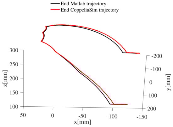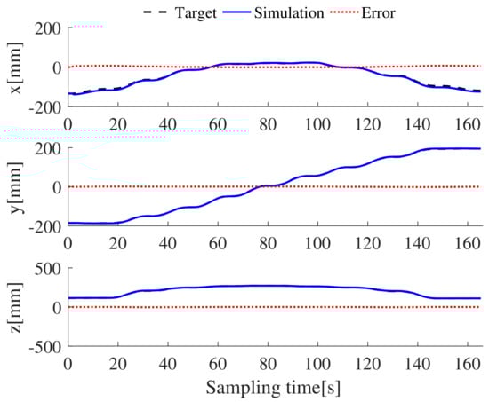 Besides the motion sequence diagram, the trajectory of the endpoint of the manipulator, the spatial coordinates of the endpoint, the virtual joint variables, and the changes of the drive cable are compared and analyzed. The experimental environment of the prototype is a complex and narrow GIS cavity. The motion trajectories of the endpoints of the manipulator and the changes of the virtual joint variables cannot be collected by appropriate external equipment, but only the changes of the six driving wires with the movement time can be collected by the prototype electronic control system. Figure 11 and Figure 12 illustrate the comparison of the end track and coordinate changes in the motion simulation of the continuous video inspection trajectory of the inner wall of the GIS cavity. It can be seen from the figures that the end trajectory of the virtual simulation is almost the same as the target trajectory (the Matlab result).