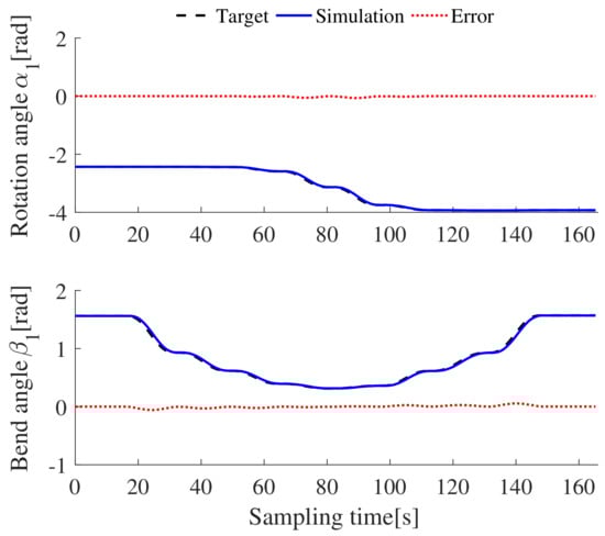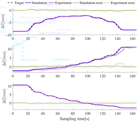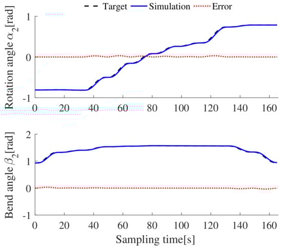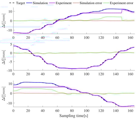 The length of the whole flexible manipulator is 304 mm. Figure 12 shows that the average error of the X-axis is 3.22 mm, the average error of the Y-axis is 1.45 mm, and the average error of the Z-axis is 2.12 mm. Virtual joint variables play an indirect role in trajectory optimization, and they can directly display the arm shape state of the two-segment flexible manipulator. Therefore, the target joint is also compared with the CoppeliaSim simulation results, as shown in Figure 13 and Figure 14. Meanwhile, the change of drive cable is the only data that can be collected from the prototype experiment, and it is compared with the virtual simulation results and target values, as shown in Figure 15 and Figure 16. It can be seen from the figures that the simulation value, the experimental value, and the target drive cable length exhibit the same variation trend, but there is an unknown error between them and the target value. It is suggested that the error of the virtual simulation results comes from the error of the virtual model and the error of the open loop control, while the error of the prototype experiment may be caused by the mechanical error of the prototype and the blockage of the DC motor. The simulation and experimental results indicate that the proposed method can solve the trajectory optimization problem of the flexible manipulator with attitude constraints.