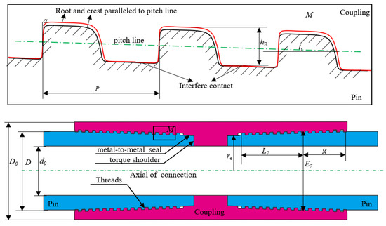 Premium connection has become one of the key technologies for wellbore integrity and safety in harsh serving wells, such as high-pressure high-temperature (HPHT) gas wells, thermal recovery wells and shale gas wells [1,2]. Differently from the API casing and tubing connection that only depends on thread interference contact sealing and a high-quality thread compound filled in the leakage path between the pin and coupling threads to meet a lower requirement of gas sealability, premium connection adopts a special metal-to-metal seal structure to attain high gas leakage resistance and a torque shoulder to control make-up torque and provide additional sealability, and it also usually adopts American Petroleum Institute (API) buttress threads or modified buttress threads for high joint strength, shown in Figure 1.
