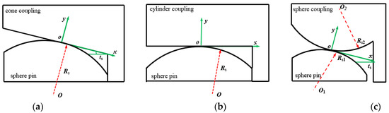 The general metal-to-metal seal structures for a premium connection can be mainly divided into four types, namely cone-to-cone seal, sphere-to-cone seal, sphere-to-cylinder seal and sphere-to-sphere seal; the latter three are collectively referred to as sphere-type seals, shown in Figure 2. Compared with a cone-to-cone seal, a sphere-type seal is a typical non-coordinated contact static seal, which tends to have higher contact pressure distribution and also yield more easily on a sealing interface. A certain yield width on the sealing interface can be conducive to blocking the micro leakage channel and forming an excellent gas seal rapidly, while a relevant larger yield width can easily lead to yield bonding and damage on the sealing surface. Consequently, accurate and efficient acquirement of the elastic–plastic contact pressure distribution on the sealing interface gives great importance to sealability evaluation for sphere-type premium connections.