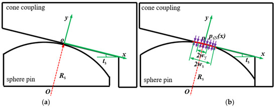 The sealing structure of a sphere-type premium connection belongs to a typical non-coordinated radial interference contact seal. According to the equivalent principle of contact mechanics [21], sphere-to-sphere contact can be regarded as sphere-of-equivalent-radius-to-cone contact, and sphere-to-cylinder contact can also be taken as sphere-to-cone with zero taper. Consequently, sphere-to-cone contact was selected as an archetype to develop the sealability evaluation model for a sphere-type premium connection. Figure 3 shows the sealing formation process for a sphere-to-cone contact premium connection. An initial circular line contact lies between the sphere pin and the cone coupling when the sealing surface starts to contact at the point of O. With make-up torque, normal interference is produced between the sphere pin and cone coupling, thus leading to normal contact pressure of psN(x) on the contact interface. When make-up torque operation completes, a circumferential sealing interface with a certain contact width of 2ws and yield width of 2wy can form to meet the required gas sealing capacity for the premium connection. Figure 3a,b show, respectively, the initial sealing contact and final sealing contact for a sphere-to-cone premium connection.