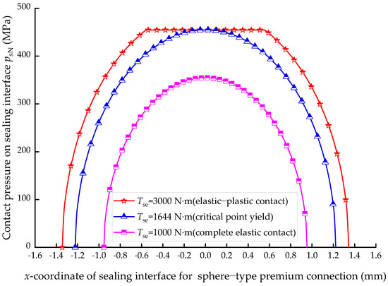 According to the previous theoretical analysis, the contact pressure distribution on the sealing interface for a sphere-type premium connection of a certain specification is directly related to the additional make-up torque from the sealing interface. Sphere-to-sphere contact can be regarded as a sphere-of-equivalent-radius-to-cone contact, and sphere-to-cylinder contact can be also taken as the sphere-to-cone with zero taper. Consequently, we firstly took the sphere-to-cone seal with sphere radius of 100 mm and cone taper on diameter of 0.1 as an example to investigate the effects of additional make-up torque from the sealing interface on the contact pressure distribution on the sealing interface. According to Equation (19), we firstly calculated the additional make-up torque from the sealing interface when initial yield was 1644 N·m. Then, we analyzed the contact pressure distribution when the actual additional make-up torque from the sealing interface Tse was 1000 N·m, 1644 N·m and 3000 N·m, respectively. The results are shown in Figure 5.