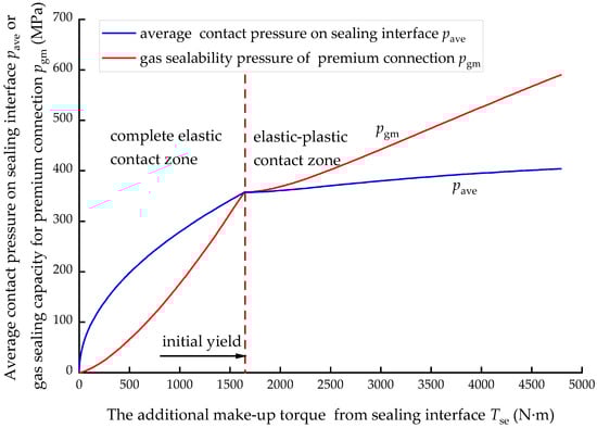 It can be seen from Figure 7 that in the complete elastic contact zone, the average contact pressure on sealing interface pave and gas sealing capacity for premium connection pgm both showed a parabolic increase with the increase of additional make-up torque from sealing interface Tse, although pgm was smaller than pave but gradually approached it and nearly equal to pave at the initial yield point. Later, the sealing interface turned into an elastic–plastic contact state. With the increase of Tse, pgm increased quickly and gradually exceeded pave. This was because the plastic deformation occurred and it blocked off the leakage passage quickly, which led to nearly invariable pave and larger and larger pgm. Consequently, the adoption of pave will overestimate the sealability of a sphere-type premium connection in a complete elastic contact zone while underestimating it in an elastic–plastic contact zone. Therefore, we recommend the sealing contact energy theory.