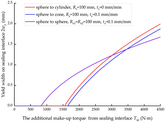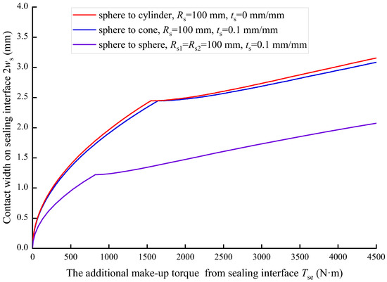 To provide theoretical guidance on sealing parameters’ design and make-up torque control for sphere-type premium connections, a comparison analysis for three types of premium connections were also conducted. Considering the different additional make-up torque from the sealing interface, the contact width, yield width, average contact pressure and gas sealing capacity for three types of premium connections, including sphere-to-cone seal, sphere-to-cylinder seal and sphere-to-sphere seal, were calculated, and the results are shown in Figure 8, Figure 9, Figure 10 and Figure 11, respectively.