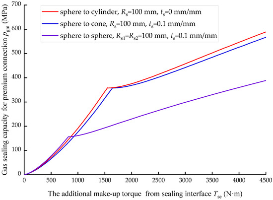 It can be comprehensively seen from Figure 8, Figure 9, Figure 10 and Figure 11 that the sealing capacity for a sphere-to-cylinder premium connection was slightly larger than that for a sphere-to-cone premium connection under the same additional make-up torque from sealing interface Tse. This was because a fraction of Tse was adopted by the thread for the sphere-to-cone premium connection. The value of Tse for a sphere-to-sphere premium connection when initial yield occurred was obviously lower than that of sphere-to-cone and sphere-to-cylinder premium connections (see Figure 9). In the complete elastic zone, the gas sealing capacity of each sphere-type premium connection was nearly equal, and this was because the sphere-to-cone and sphere-to-cylinder premium connections had larger contact width and smaller average contact pressure while the sphere-to-sphere premium connection had smaller contact width and larger average contact pressure (see Figure 8 and Figure 10), which produced fair sealing contact energy for the three types of premium connections. In the elastic–plastic zone, although the average contact pressures for three types of premium connections were relatively close to each other, the contact width for sphere-to-sphere was obviously smaller than that of sphere-to-cone and sphere-to-cylinder premium connections, thus leading to obvious lower gas sealing capacity for the sphere-to-sphere premium connection. Consequently, a proper larger sphere radius should be selected for a sphere-type premium connection, which can reduce the risk of yield sticking on the sealing interface and also improve the gas sealability of the connection.