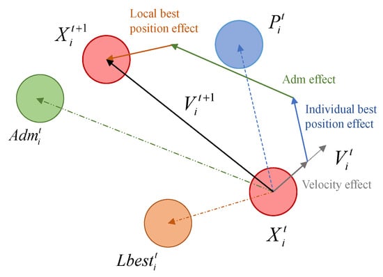 In this paper, the traditional PSO is improved by introducing the concept of corporate governance and adding adaptive parameters and acceleration coefficients. The update of particle positions in two successive iterations can be shown in Figure 1, and the specific update formulas of velocity and position are as follows:
