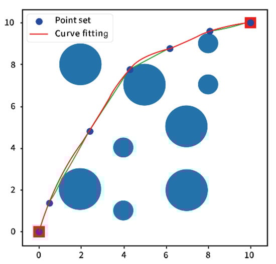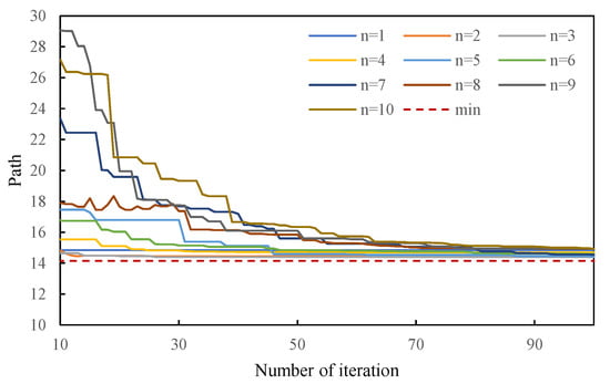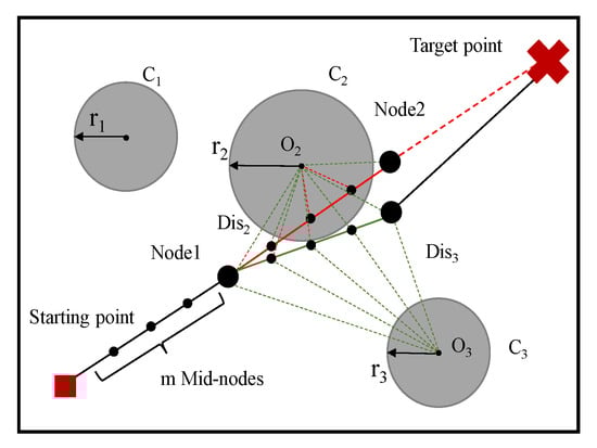The traditional particle swarm optimization (PSO) was proposed by Kennedy in 1995 to search the global optimal value of objective function by imitating the foraging behavior of birds. It has the characteristics of simple structure, easy implementation, and wide application []. Its improved algorithms are widely used in path planning [,]. However, the PSO algorithm has shortcomings such as slow convergence speed, and it is easy to fall into local optimum.