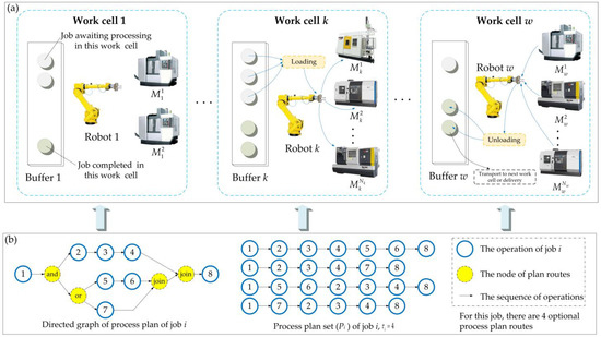 Composition of workshop: (a) schematic diagram of w work cells; (b) schematic diagram of process planning for a job.