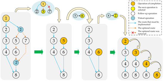 In general, the intelligent workshop is a flexible manufacturing system composed of industrial robots, machines, and other hardware, and information acquisition and control software. In the intelligent workshop, the robot is the executor of scheduling schemes, such as the loading and unloading of jobs on the machine [5]. At the same time, the robot is also an element to be considered in scheduling optimization. The machines and robots are regarded as limited resources, and the production capacity of the workshop is constrained by both of them at the same time, which is a dual-resource constraint [6]. In addition, in a flexible manufacturing system, due to the diversification of processing methods, a job may have multiple alternative process plans. Scheduling decisions should consider not only the process plan flexibility of the job, but also the machine flexibility of the operation [7]. Therefore, in the complex and dynamically changing intelligent workshop, the workshop scheduling problem, which takes robots and machines as production resources and considers high flexibility, is a more complex flexible job shop scheduling problem (FJSP).