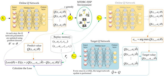 In the mass customization environment, the changing order and machine state are highly flexible, and the scheduling decision system needs to conduct adaptive self-optimization for such a dynamically changing workshop environment [29]. Therefore, the real-time generation of scheduling schemes becomes very important. Scheduling solutions based on mathematical modeling, the heuristic algorithm, the metaheuristic algorithm, and other algorithms [30,31,32] require iterative calculation and show poor real-time performance. Priority-based scheduling rules can effectively improve real-time decision-making. Choosing different priority rules according to dynamic changes is usually better than using a single priority rule. Therefore, the current related studies are focused on scheduling policies involving the dynamic selection of priority rules. This type of scheme completes the development of the scheduling policy through offline training, and then carries out high-quality and real-time scheduling online. Commonly used methods include genetic programming, machine learning (ML), and reinforcement learning (RL). The genetic programming method is carried out through iteration and population evolution. The disadvantage of this method is that it takes time to check the performance of candidate rule sets, which reduces the real-time scheduling. ML is used as a data mining tool to mine the historical data of the workshop. Based on the supervised learning method of classified tasks, appropriate scheduling rules are selected according to the real-time state of the workshop [33,34,35]. Different from ML, RL can establish direct mapping from environmental states to actions. Furthermore, deep reinforcement learning (DRL) using neural networks as value or policy functions can also handle complex tasks. These characteristics make DRL a more effective method for scheduling research in complex flexible manufacturing systems.