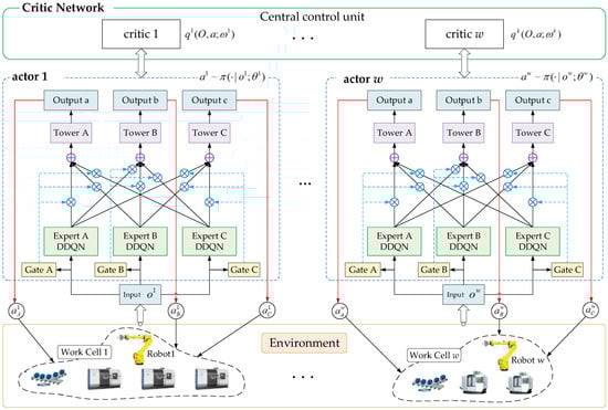 The studies above all adopted the centralized model of a single agent and assumed that it was globally observable. This method lacks flexibility and autonomy. In order to overcome this shortcoming, Luo et al. [38] proposed a real-time scheduling method based on hierarchical multi-agent DRL. This method includes three agents: scheduling objective, job selection, and machine selection agents. This method effectively solves the dynamic multi-objective FJSP with new job insertion and machine failure. Liu et al. [39] proposed a layered and distributed framework to solve the dynamic flexible job shop scheduling problem. Based on the double-deep Q-network (DDQN), the machine selection agent and job sequencing agent are trained to make real-time scheduling decisions for the FJSP with the job deadline. Johnson et al. [40] proposed a DDQN-based multi-agent reinforcement learning method to solve the FJSP problem of robot assembly cells. Each agent in the assembly unit is trained in a centralized way and executes scheduling decisions independently according to local observations. The experimental results showed that this method had good performance in optimizing the maximum completion time.