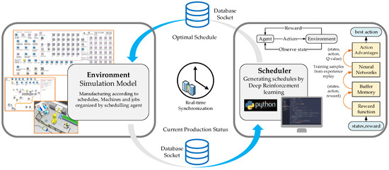 In this section we verify the effectiveness of the proposed real-time scheduling decision method based on MTMARL. Based on the model established in Section 2, the scheduling environment was developed using digital factory simulation software. The reinforcement learning training framework was developed in Python 3.8 according to Algorithm 1. The Socket communication mode was used for the interaction between the agent and the simulation environment to achieve performance training of the agent, as shown in Figure 6. Here, the Python development environment served as the server, and the scheduling simulation environment served as the client. As the digital factory simulation software can directly handle the data collection and command control in the workshop, this integrated interaction method improves the applicability of solving practical problems. The scheduling decision performance was studied throughout the simulation process by changing the number of cells, machines, and jobs, and the process planning data of jobs.
