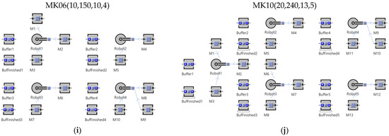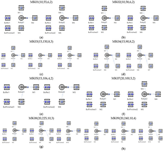 The number of jobs and resources and the environmental layout of each calculation example based on the parameters in Table 2 are shown in Figure 7. For example, MK05 (15,106,4,2) represents the scheduling environment generated by MK05, which contains 15 jobs, 106 operations, and 4 machines divided into 2 work cells and 2 robots.