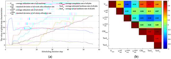 The designed reinforcement learning scheduling framework interacts with the scheduling environment in each example. Obtain global state information through local observations. The state data of production scheduling were collected in the interaction process, so as to objectively evaluate the correlations between state characteristics. In this paper, the results obtained from MK01 were used for correlation analysis. In this example environment (shown in Figure 7a), there are two robots; each robot is responsible for supervising 3 machines, the number of jobs is 10, and the number of operations is 55. Figure 8a shows the change trend of state characteristic values with the decision time steps. According to the curve of the change trend, the state characteristics related to resources, including the average utilization rate of machines, the standard deviation of work cell utilization rate, and the average utilization rate of robots and its standard deviation, can quickly reach a stable numerical range as the number of decision steps increases. It can also be seen from the figure that after the trend stabilizes, the utilization rate of machines and robots is relatively close, which is about 60%. First, the utilization rate of the machine indirectly reflects the utilization rate of the work cell, which can be verified by Formula (29). Second, the utilization rate of the robot is restricted by tasks and resources in the work cell. The utilization rate of the robot is related to the work cell, which can be verified by the standard deviation curve of the utilization rate in Figure 8a. Therefore, the average utilization ratio of machines and robots is close. At the same time, the standard deviation of work cell and robot utilization rates is maintained around 10%, indicating that the load of each robot, work cell, and processing task are relatively balanced, effectively reflecting the scheduling objective of Formula (3) to minimize the workload difference among all robots.