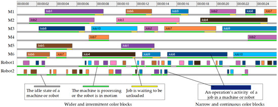 In addition, a Gantt chart of scheduling at each time was continuously generated in the process of real-time interaction between the scheduling environment and the agent. This real-time scheduling chart for the MK01 example environment is shown in Figure 9. In this Gantt chart, there are two kinds of color blocks. (1) Wider and intermittent color blocks. One block represents one operation of a certain job. One color represents one job. The length of the color block indicates the time of processing, loading, or unloading. The sequence of each job on the machine or robot is displayed by the order of the corresponding color blocks on the time axis. (2) Narrow and continuous color blocks. There are three colors in total, namely gray, green, and yellow. Among them, gray indicates that the machine or robot is in an idle state, green indicates that the machine is processing or the robot is in motion, and yellow indicates that the job on the machine has been processed and is waiting to be unloaded. The length of the color blocks indicates the duration of each state. It can be found that the robot has loaded and unloaded each job, and the machine has completed the processing of the job, and various constraints have been met in the scheduling model. The Gantt chart shows that the designed scheduling environment and reinforcement learning real-time scheduling method are suitable for solving the scheduling problem proposed in this paper.