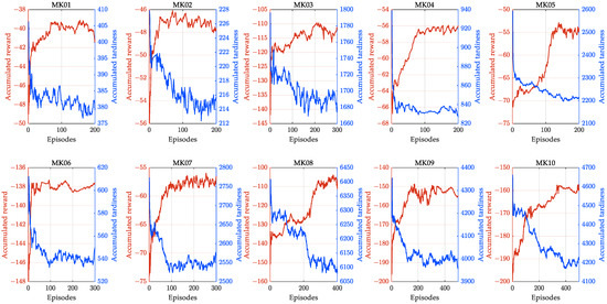 In order to further analyze the effectiveness of the proposed multi-task multi-agent reinforcement learning algorithm to solve the FJSP-DP problem, the convergence performance of the 10 groups of data derived from MK01–MK10 was analyzed. Different episodes were selected according to the size of the example. Figure 10 shows the global reward convergence of the proposed algorithm when solving scheduling problems of different scales. The red line in the figure is the convergence curve of the global reward function. It can be seen that with increased training rounds, the global reward function value gradually converges to a certain value.