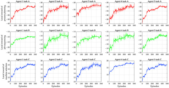 In order to analyze the performance of each agent when executing multi-task decisions, the convergence performance of local reward for each decision task was analyzed based on the FJSP-DP scheduling example using MK10, whose environment layout as shown in Figure 7a. Figure 11 shows the local reward convergence of each agent executing its own scheduling decision task in this example. For each decision task of each agent, its corresponding local reward function curve was drawn. There are two obvious trends in the figure. First, it can be seen that all agents were able to complete their associated tasks and maximize the specified reward function. Second, the proposed algorithm has a fast convergence rate. For most agents, the reward function for most tasks will converge when there are fewer than 100 episodes. Moreover, the stability of local reward convergence is better.