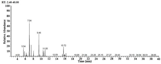 The GC/MS chromatogram of the analysis of Juniperus phoenicea leaf extract.