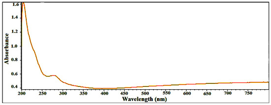 The optical properties of the prepared TiO2 NPs were analyzed by using UV-visible spectrophotometer (Shimadzu, Kyoto, Japan). Briefly, the sample (3 mL) was taken in a quartz cuvette and further scanned in the wavelength range of 200–800 nm (resolution of 1 nm). The resulting spectrum was collected using the spectrophotometer software and major peaks were identified [32].