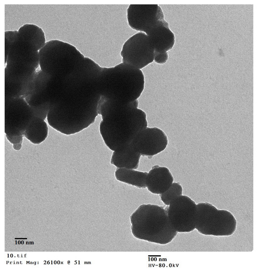 TEM image of the biosynthesized TiO2 NPs (Figure 4) revealed that the morphology of the biosynthesized titanium oxide nanoparticles possesses a uniform spherical structure in shape having a diameter in the range of 10–30 nm.