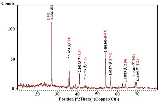 Figure 5 represented XRD pattern of biosynthesized titanium oxide nanoparticles using Juniperus phoenicea leaf extract. Nine distinct peaks at 2θ = 27.1°, 35.7°, 40.8°, 43.9°, 53.9°, 56.0°, 63.9°, 68.8°, and 69.8° that can be indexed as (110), (101), (111), (210), (211), (220), (310), (301), and(112) Miller indices. The JCPDS Card no. 21-1276. The existence of peak pattern confirmed the crystal structure of TiO2 NPs. XRD pattern showed the crystalline nature of the TiO2 nanoparticles and the calculated average size of TiO2 nanoparticles ~10 nm. The peaks sharpness and the absence of unknown peaks confirmed the crystalline nature and high purity of the biosynthesized TiO2 NPs.