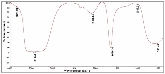 FTIR spectrum of biosynthesized titanium dioxide nanoparticles using Juniperus phoenicea leaf extract revealed peaks at 3851.01, 3449.51, 2084.14, 1636.36, 1045.34, and 553.48 cm−1 (Figure 6). Peak observed at 3851, 3449 cm−1 denote the O–H stretching of alcohols and phenolic compounds, and peaks at 2084.14, 1636.36 cm−1 correspond to the C-O stretching, C=O stretching mode of the carbonyl functional groups in esters, ethers, acids and alcohol and C=C stretching (alkene). Peak at 1045 indicates the C–N stretching of aliphatic amines and the peak observed at 553 cm−1 coincides with the Ti–O–Ti stretching vibration of TiO2 NPs.