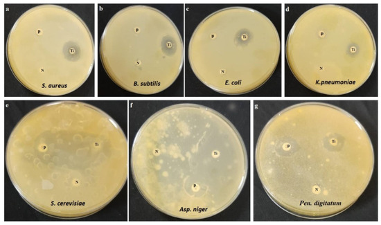 The antimicrobial efficacy of biosynthesized TiO2 NPs against tested microbial strains. (a): S. aureus; (b): B. subtilis; (c): E. coli; (d): K. pneumoniae; (e): S. cerevisiae; (f): Asp. Niger; (g): Pen. digitatum. (P) positive control; ( N) negative control;(Ti) TiO2 NPs.